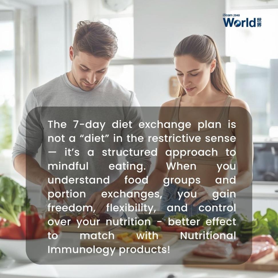 The 7-day diet exchange plan is not a “diet” in the restrictive sense – it’s a structured approach to mindful eating. When you understand food groups and portion exchanges, you and freedom, flexibility, and control over your nutrition – better effect to match with Nutritional Immunology products!