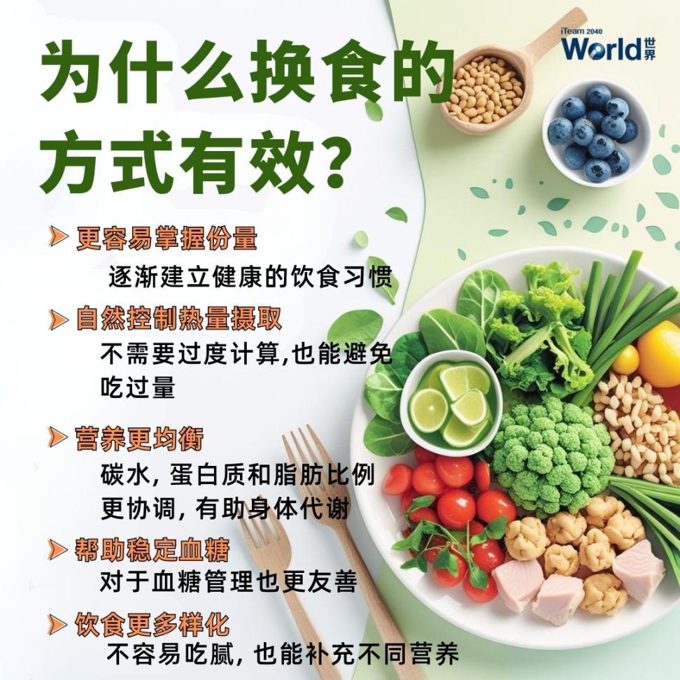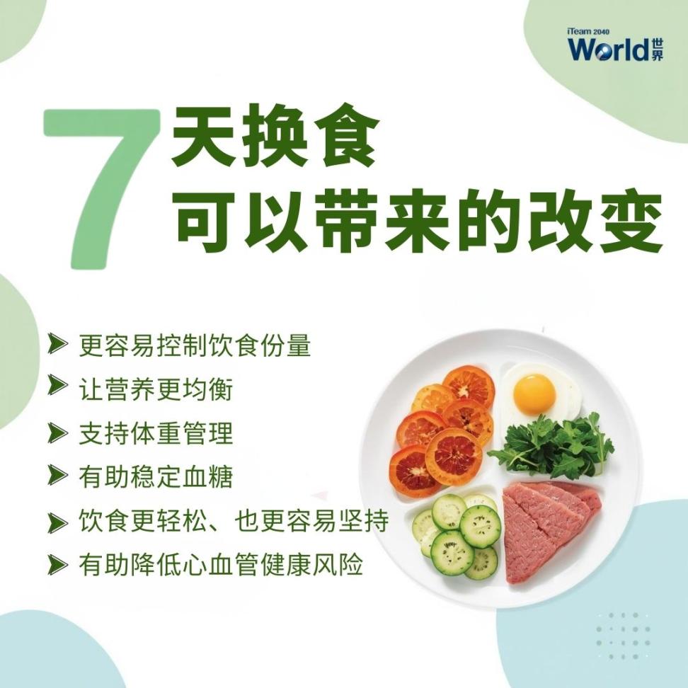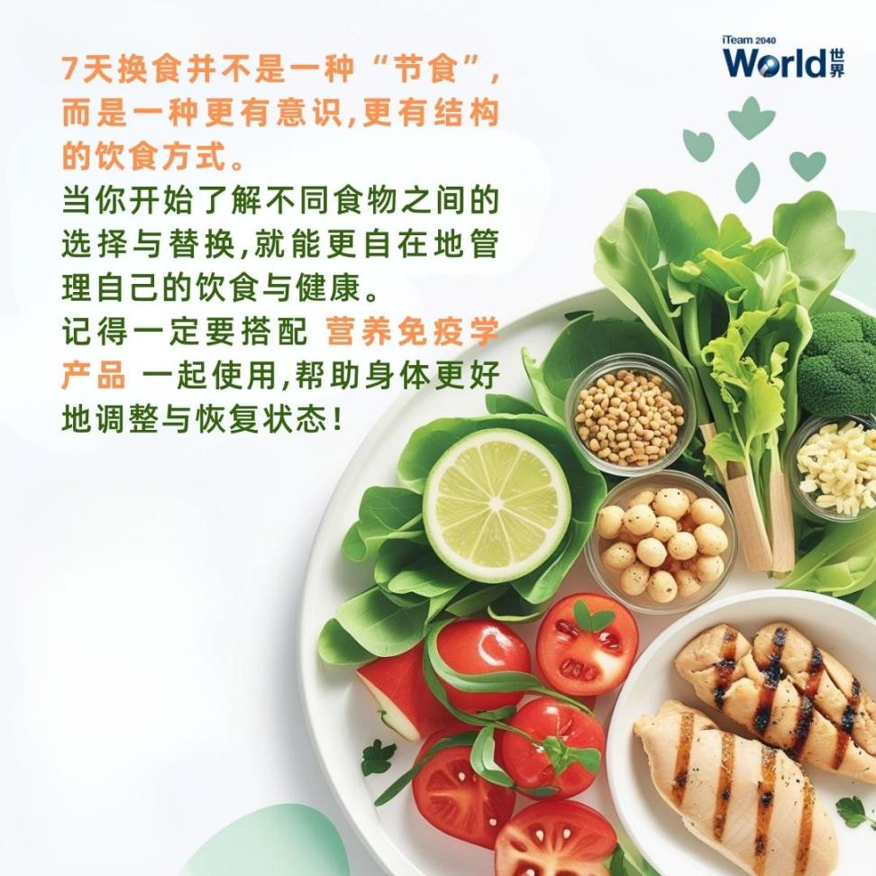 健康饮食并不代表要挨饿,也不是要完全戒掉喜欢的食物。7天换食的概念,是通过在同一类食物中做出更好的选择与替换,让营养保持平衡,同时减少身体的负担。这样的方式既灵活,也更容易长期坚持!