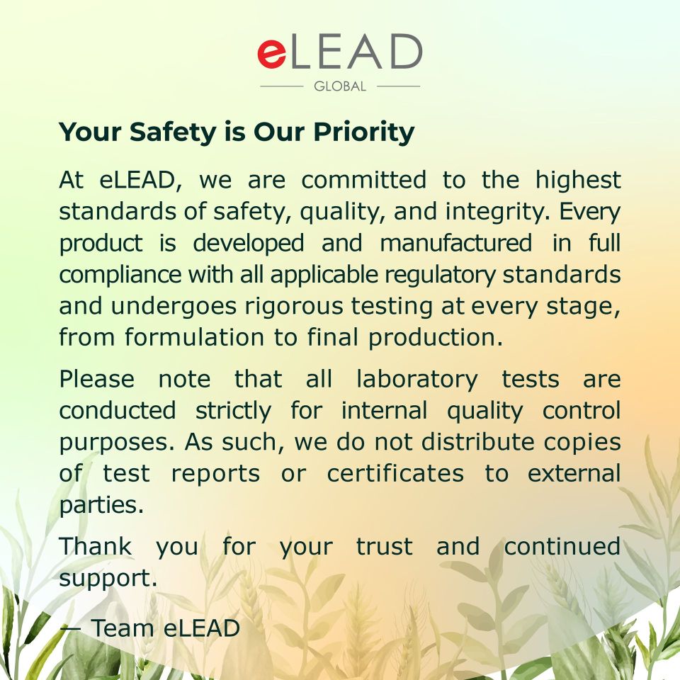 At eLEAD, we are committed to the highest standards of safety, quality, and integrity. Every product is developed and manufactured in full compliance with all applicable regulatory standards and undergoes rigorous testing at every stage, from formulation to final production.