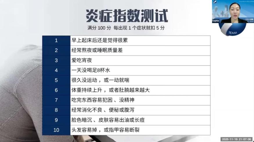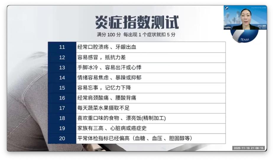 大家可以拿出计算机或者是用心算算一下, 来看看自己是否处于高炎症或者是低炎症。 那满分是100分, 出现一个症状就扣5分。